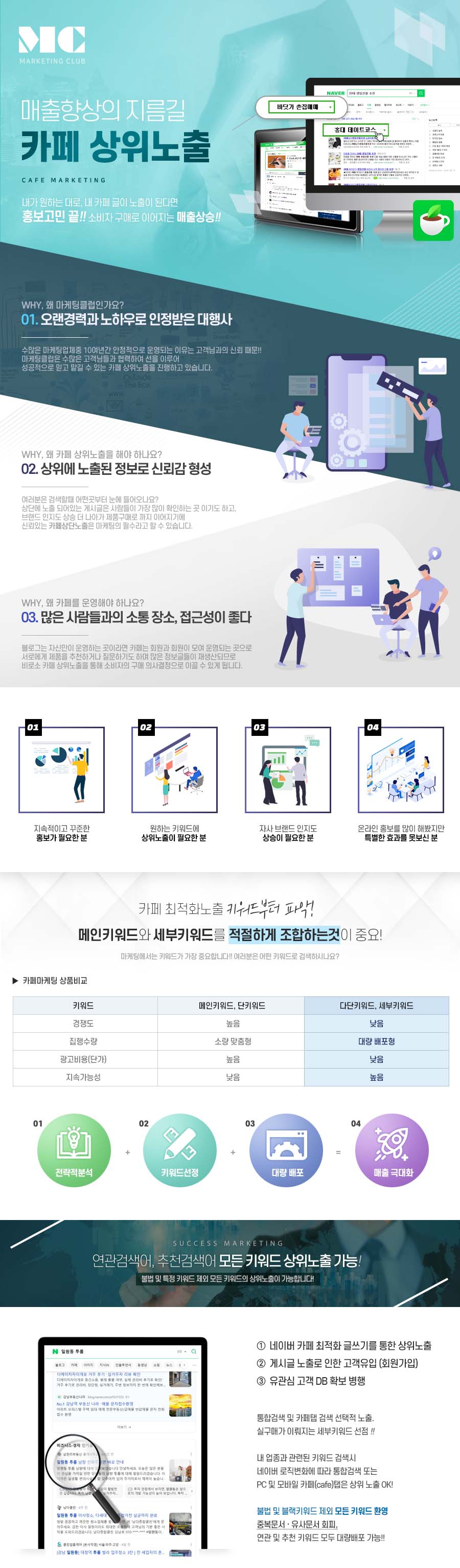 네이버는 최근 통검노출에서 카페글을 노출시켜 주고 있는데, 브랜딩 네이버카페에 발행(작성·배포)하여 상단노출 시키는 것을 말합니다. 카페탭은 물론 통합검색 및 인기글에도 노출되는등 효과적이고, 소량의 단키워드 보다는 대량의 세부/다단키워드, 다양한 키워드를 빠르게 공략할 수 있으며, 한번 작성된 카페상위노출 포스팅은 오랜기간 노출 지속되거나 블로그에 비해 가성비 좋은 특징이 있습니다.